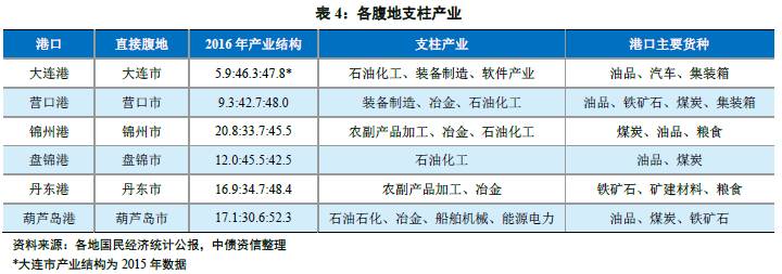 从各直接腹地支柱产业看,大连市作为东北地区重要的贸易、工业、旅游城市,支柱产业类别较为丰富;营口、锦州、盘锦支柱产业相似,以冶金、石油石化等强周期行业为主,受经济周期波动影响较大。丹东市和葫芦岛市自身经济实力较弱,且支柱产业对经济的贡献度亦在逐渐下滑。