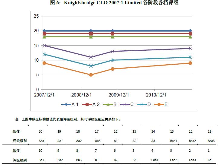(5)不同产品间管理人的主动性差异较大。对于信用卡ABS和车贷ABS,其发行方或相应参与机构对于循环池的管理比较被动,主要是保证ABS按照预设条款来运行,以保证各方利益;而循环CLO一般都会授权资产管理人对基础资产进行积极管理(当然,这也得益于美国拥有较为成熟的贷款二级市场)。也就是说,除了计划内/计划外资产的偿付、有较高用风险或已经违约资产的卖出等需求外,资产管理人在再投资期也有很大的自由空间,可以在交易文件所限定的范围内,通过资产的买入或卖出,以抓住市场机会并对信用事件做出快速反应,实现降低损失和提高收益。当然,这会对资产池的质量结构有所影响,产品评级结果也会有所变化,图6展示了穆迪对Knightsbridge CLO2007-1 Limited(循环CLO)在不同时期的各档评级结果,可以看出在产品存续期间部分档次级别呈现先降后升的趋势。所以,从另一角度讲,CLO的表现高度依赖于资产管理人的质量和水平,资产管理人的资产池管理水平和会成为信用评级中一个重要的考虑因素。仍以Knightsbridge CLO2007-1 Limited(以下简称“KB CLO 2007-1”)为例,2010年5月, Ares Capital Corporation通过并购取得了对KB CLO 2007-1的控制和管理权;由于Ares Capital Corporation在CLO投资和资产管理中的丰富经验和优先的历史表现,此次资产管理人变更没有对KB CLO 2007-1证券的评级带来负面影响,甚至部分档次级别有所上升。