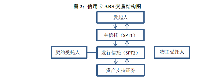信用卡ABS一般采用双SPV结构。第一层为主信托(Master Trust),在这个结构中信用卡应收账款出售者(通常是银行或者信用卡公司)把应收账款转让给了受托人,实现了真实出售和破产隔离,同时也便于发行系列证券。第二层信托为发行信托(Issuance Trust),即主信托与物主受托人(Owner Trustee)签订信托协议,相应设立的信托。