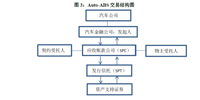 车贷ABS一般情况下同样采用双SPV结构。在此双SPV结构中,第一层为产品发起人成立的应收账款公司作为SPC,起到真实出售和破产隔离的作用,且该SPC可以作为常设机构,持续“买卖”基础资产、发行ABS产品,从而将ABS运作常态化。第二层为SPT,其作用与信用卡ABS的发行信托作用一致。
