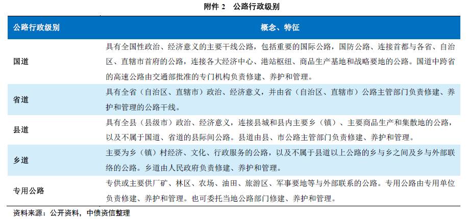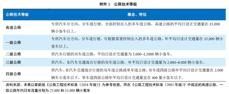 根据《公路工程技术标准》,按照功能和适应的交通量,公路可以分为5个等级,分别是:高速公路、一级公路、二级公路、三级公路、四级公路,另外,存量公路仍有部分不符合最低技术等级要求的等外公路,按照公路法的要求,等外公路应采取措施,逐步改造为符合技术等级要求的公路。通常,二级及以上公路被称为高等级公路。(具体分类标准见附件1)。