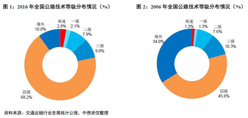 我国公路主要分布在广大农村地区,目前四级公路和三级公路仍占我国公路的绝大部分。随着经济的发展、财政实力的提升、汽车保有量的增加,人们对高等级公路的需求有所提升,近年高等级公路里程增长较快。截至2016年末,全国公路里程合计469.63万公里,其中二级及以上等级公路60.12万公里,占全部公路总里程12.8%,较2006年提高2.6个百分点;高速公路13.10万公里,占公路总里程2.8%;一级公路、二级公路、三级公路、四级公路占比分别为2.1%、7.9%、9.0%和68.2%。