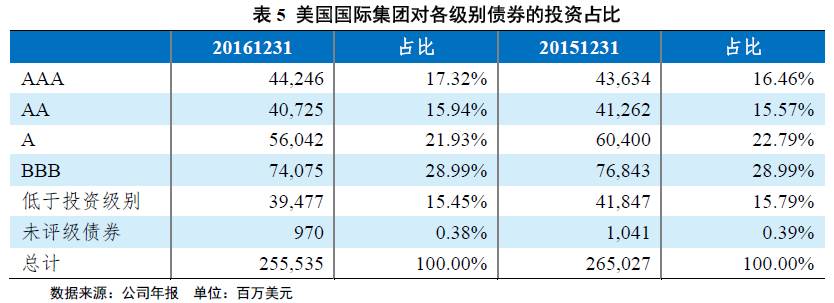 截至2016年12月底,财险公司持有的美国国内固定收益证券的投资平均久期为4.7年,主要由免税债券组成,此外还有应税的市政债券、政府债券、企业债等,大部分债券的评级在A以上;持有的国外固定收益证券平均久期为3.5年,主要债券级别也在A及以上。