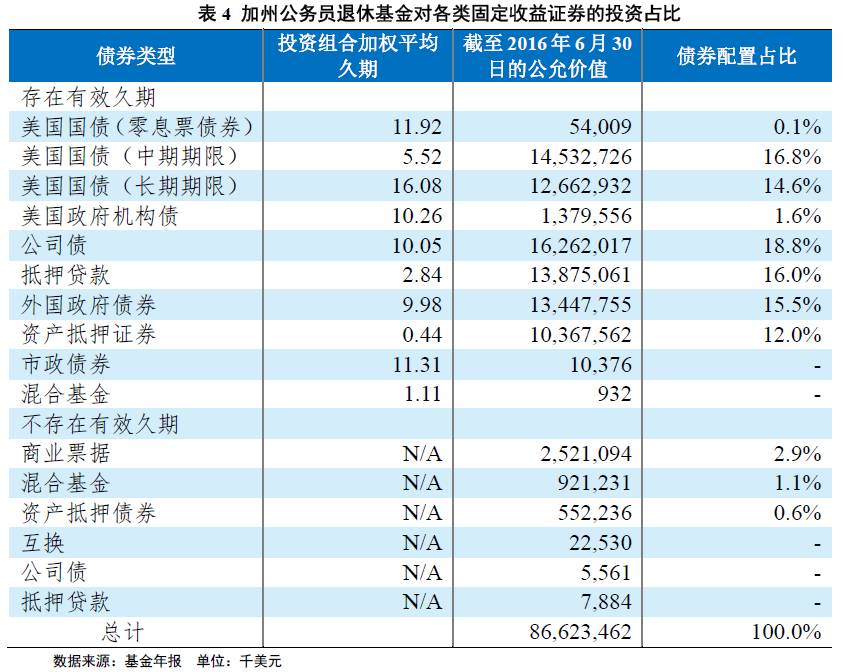 截至2016年6月30日,在固定收益资产投资上,公共雇员退休基金(PERF)以90%巴克莱长期负债指数(BarclaysLong Liabilities)加10%巴克莱国际固定收益指数(Barclays International Fixed Income)为基准,共投资866亿美元,投资回报率为9.3%,基本匹配指数收益率。在投资风险控制方面,公司主要投资于投资级债券,级别主要参考标普、穆迪等机构的级别,对于外部级别未覆盖的债券,公司主要通过内部分析来确定风险。除传统固定收益资产外公司还投资于一定数量的资产证券化产品。