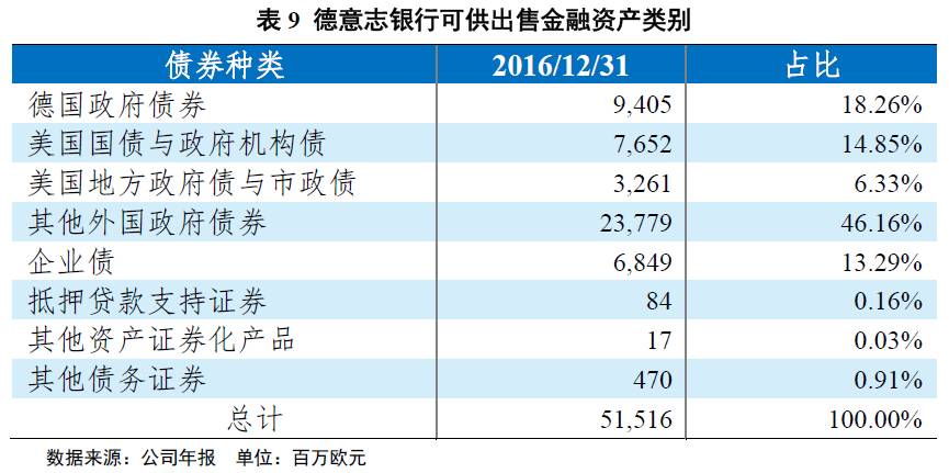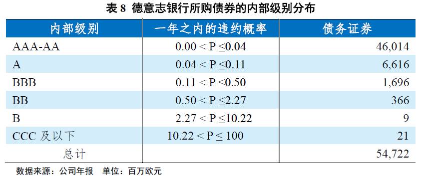 德意志银行的偏好与渣打银行类似,风险偏好较为保守,公司也以债券配置为主,股票占比极少,并投资少量资产证券化产品,截至2016年底,共配置债券547.22亿欧元,股票11.49亿欧元,资产证券化产品1.01亿欧元。在具体债券投资上,公司购买债券均需内部机构评审,当前所购债券主要为投资级债券,占比99.27%。
