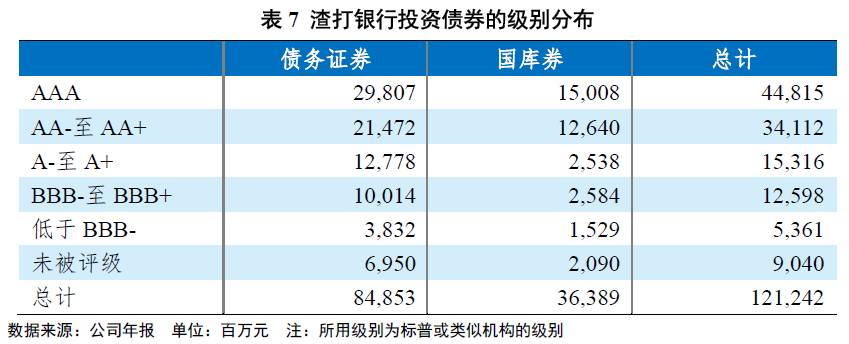 截至2016年12月31日,渣打银行共投资债券1212.42亿元,占比约98%,其余为股票投资。在具体债券投资上,渣打银行以企业债为主,且所投债券主要为投资级债券。如下表所示,2016年,渣打银行持有债务证券占比约为70%,国库券占比约为30%,在级别的分布上,投资级债券占比约为88%。在期限分布上,短债占比略高,到期期限在一年以内的债券约占投资额的48%。除一般债券投资外,渣打银行还投资一定数量的高级别资产抵押证券,投资额约占集团总资产的1%。