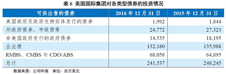 美国国际集团(AIG)在全球范围内进行资产配置,以公司债、市政债券与政府债券为主,较少投资于高收益债券、股票、房地产与对冲基金,2016年公司共投资固定收益证券2,415.37亿美元。AIG追求一种多元化、高质量的固定收益证券投资组合,投资主要针对保险负债的具体特征来设计,下属财险公司与寿险公司的偏好略有不同。