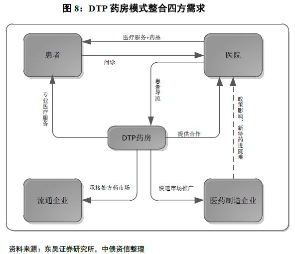 1、DTP药房模式即药店获得制药企业产品经销权,患者在医院获得处方后从药房直接购买药品并获得专业指导与服务的模式。区别于以出售OTC药品为主的传统零售药店,DTP药房主要销售高毛利专利药物、新特药、自费药等,并配备执业药师提供专业指导意见及服务,是零售药店的进阶模式。DTP药房完整串联了供给端(制药企业)、处方端(医院)以及需求端(患者),是未来医药处方外流的主要承载主体,成为药品流通过程中的重要角色。