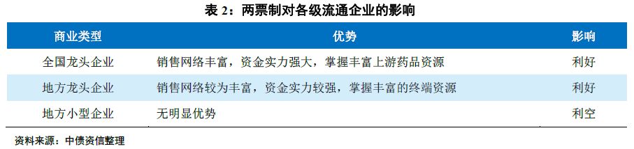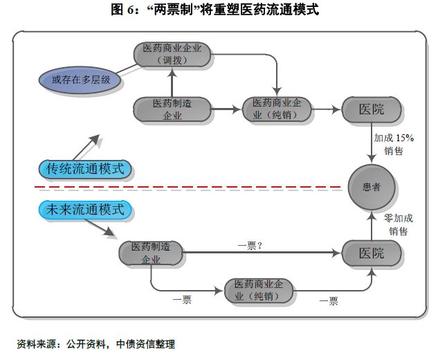 所谓两票制是指药品生产企业到流通企业开一次发票,流通企业到医疗结构开一次发票。福建省是全国最早执行药品两票制的省份,于2012年开始试点执行。2016年4月,国务院办公厅发布《国务院办公厅关于印发深化医药卫生体制改革2016年重点工作任务的通知》,明确提出在医改试点省份实行两票制即地方版两票制,鼓励公立医院综合改革试点城市推行两票制,拉开了在全国范围内推广两票制的序幕,同期营改增的落地提升了两票制可操作性(增值税具有可追溯性且虚开、伪造增值税将触犯刑法,使得倒票、过票等行为承担的风险大幅提升)。