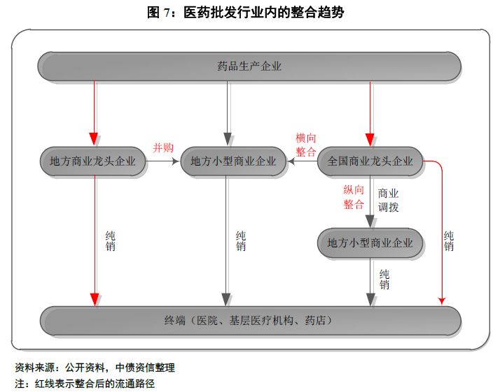 随着行业的发展,未来批发企业与零售企业之间的界限将更为模糊。其一,以纯销为主的企业,存在向零售渠道拓展的动力(目前零售药店销售占比很低,未来空间很大),进一步提升自身拥有的客户资源,加强渠道控制力。至此,这类企业兼具了批发与零售两种属性。其二,以经营连锁药店为主业的企业,横向方面通过兼并其他连锁药店或者单店,进一步提升自身客户资源、加强渠道控制力,纵向方面,该类企业基于客户资源优势及很强的渠道控制力,可跳过或者通过兼并上游商业企业,直接向药品生产企业采购药品,降低采购价格,提升成本优势。这类以经营连锁药店为主业的企业亦兼具了批发与零售属性。