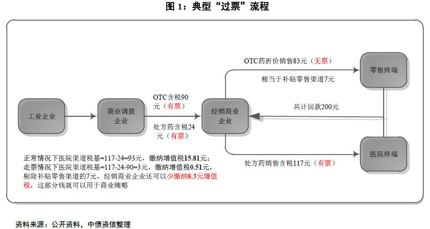 2、典型“过票”流程及危害:过票流程如图1所示,“过票”行为对医药流通行业带来多方面的危害:首先过票行为由于偷逃国家税收,使得“过票”企业经营成本要低于规范经营企业,易形成不公平竞争,扰乱市场秩序;其次过票行为票、货分离,不规范的流通方式易造成用药安全隐患;再次过票行为为流通环节的其他违法违规行为提供了资金来源,医药代表利用这部分资金进行非法手段促销,不利于不同品种药品间的公平竞争,易造成高价低效药占据大量市场份额的情况。