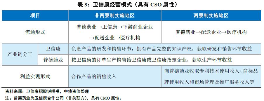 3、CSO即合同销售组织,是近年来国外颇受欢迎的商业机构组织,为客户提供整体营销的专业服务,囊括了市场调研、产品策划、市场推广、渠道设计等专业的服务内容,真正的CSO企业本身并不参与到物流、票据等方面实际销售行为中去。目前国内药品销售制度尚处于规范过程中,国内CSO市场正处于引入期。近年在两票制及营改增的相互配合下,国内药品销售市场规范步伐加快,大量中小医药流通企业将丧失药品销售资质,转型CSO将成为这类企业较好的选择,随着专业化分工深入,部分有实力的企业主动涉足CSO行业,试图占有先发优势,这些都将成为CSO爆发增长的强大推动力。下表为上市公司卫信康的经营模式,该公司在两票制实施地区采用CSO模式来经营。