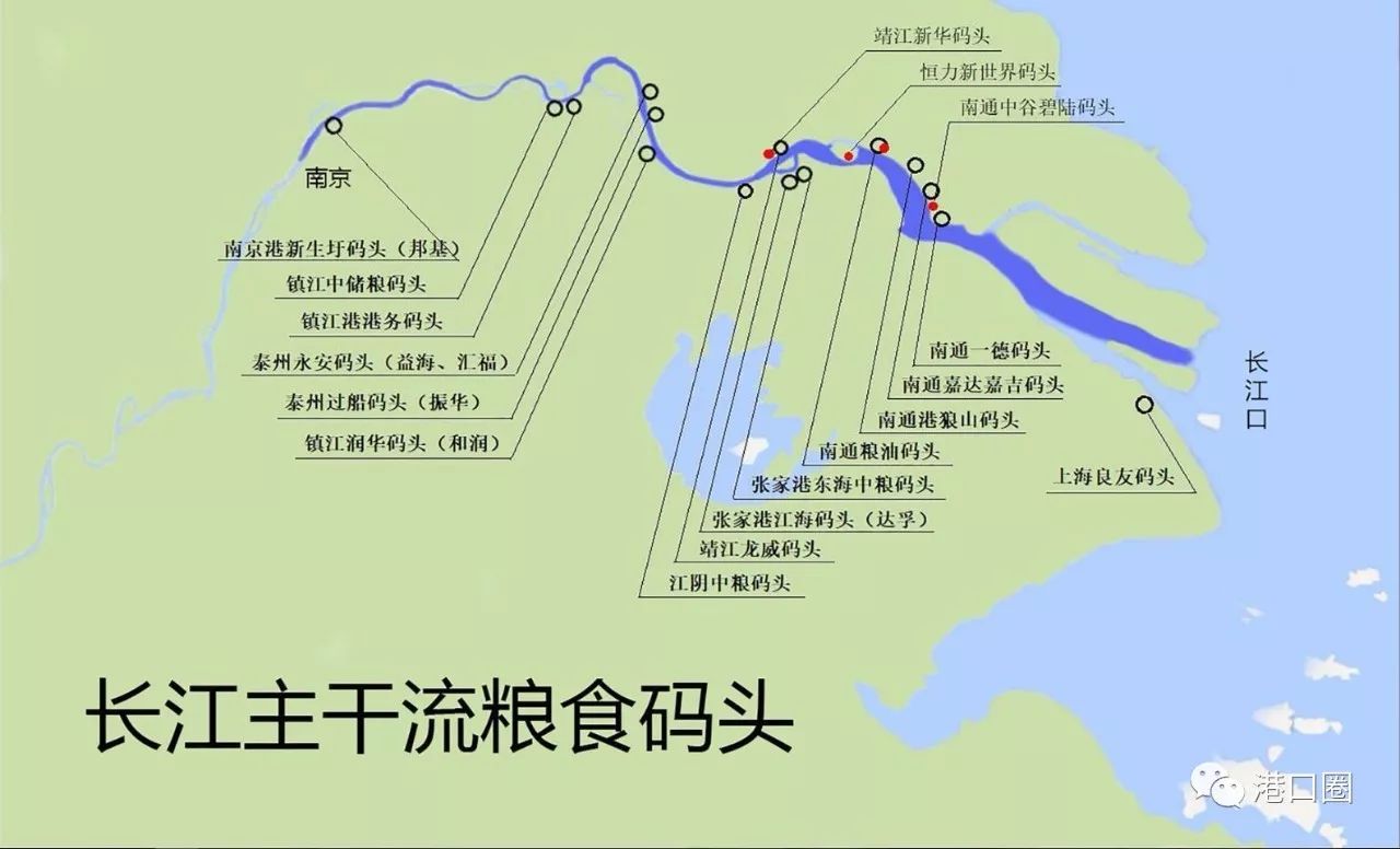南京大桥以下至长江出海口的港口分布于长江两岸的南京、镇江、泰州、无锡、南通、苏州和上海等城市,码头区域涵盖了直辖市、地级市、县级市以及镇区等多重复杂的行政关系和资产关系。政府审查批准直靠外轮作业的主要粮食码头有15家:南京港新生圩码头、镇江港中储粮码头、镇江港扬中润华码头、镇江港港务码头、泰州港永安码头、泰州港过船港务码头、泰州港靖江龙威码头、无锡港中粮江阴码头、南通港粮油码头、南通港狼山港务码头、南通港嘉达港务码头、南通港一德码头、苏州港的张家港东海中粮码头、苏州港的张家港江海粮油码头、上海港良友码头。另外,有一大批码头从事简单的内贸粮食中转装卸营业,如南通的中集、恒力新世界、永友、中谷碧陆码头,靖江的新华、扬子江码头,镇江的中林新民洲码头,等等。