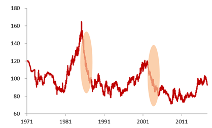 图8:里根和小布什减税时期财政赤字导致美元指数下跌
