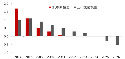 为了将减税对总产出的影响进一步量化,美国税收政策中心(Tax Policy Center)进行了相关预测(图4)。基于凯恩斯模型,减税会通过刺激总需求促进经济增长,第一年会拉动经济在原有基础上提高1.7%,第二年提高1.1%,正面效应将持续五年,但边际效应递减。基于世代交替模型,减税会通过影响家庭决策进而影响潜在产出的变化,据此估计减税会在前几年拉动经济增长,但自2024年开始会出现负向影响。原因可能在于总需求扩大会提升通胀水平,导致美联储继续提高利率,对私人部门投资产生挤出效应。因此,税改对产出的影响主要集中在短期,长期利好将逐渐消退,并有可能出现负面影响。