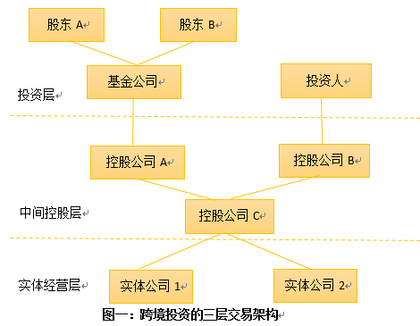 出于以上多方面以及信息披露等因素的考虑,跨境并购的交易方往往会设计很复杂的跨境交易架构,但是其可以简单概括为三个层级,包括最上面的投资层、中间控股层以及下层的实体经营层。具体来说,投资层,主要是最终投资人或受益人,但并非只有这一层,基于股东背景保护、遗产继承等因素可能也会构建一些离岸公司或离岸信托计划以及基金公司等。中间控股层主要用作为投资者和下层实体经营层之间的协调机构,根据实际需要也可能为多层架构,其设计需要考量很多因素,将在下面重点说明。而实体经营层可以由境外的中间控股公司直接持有,也可以通过在标的国当地设立本地控股公司持有该实体经营层企业股权。
