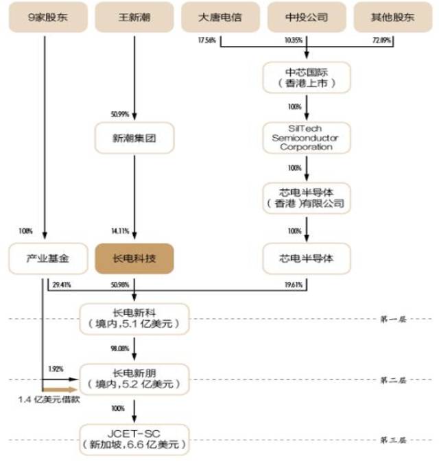 这是一个交易架构设计比较复杂的并购。从收购主体看,此次收购并非由长电科技直接出手,而是与国家集成电路产业投资基金股份有限公司(下称“产业基金”)、芯电半导体(上海)有限公司(下称“芯电半导体”)联合进行收购。首先,三家联合出资5.1亿元成立苏州长电新科投资有限公司(下称“长电新科”),其中长电科技出资 2.6 亿元、产业基金出资 1.5 亿元、芯电半导体出资 1 亿美元,持股比例分别是 50.98%、29.41%、19.61%,这其中长电科技具有对长电新科控制权。其次,长电新科与产业基金合作成立长电新朋,长电科技出资5.1亿元,产业基金象征性出资 1000 万美元同时向长电新朋提供 1.4 亿美元股东贷款,最终以 6.6 亿美元设立了中间层的新加坡中间控股公司 JCET-SC。同时,在股东各方协调下,中国银行出具了 1.2 亿美元的贷款承诺函,为 JCET-SC 的收购行为提供融资安排。由此, JCET-SC 可用于收购的资金合计达 7.8 亿美元。