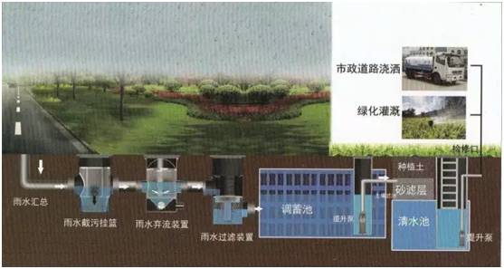 示范区所展示的雨水收集模块贮水池,能有效的将收集来的雨水进行存储,这些存储的水资源,经过处理后可用于冲洗厕所、清洗路面、浇灌草坪、水景补水等。