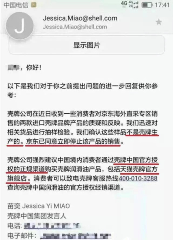 今年6月,壳牌指认京东出售假润滑油事件闹得沸沸扬扬。在壳牌官方确认京东自营店出售的润滑油非壳牌生产后,京东立即下架了相关产品。