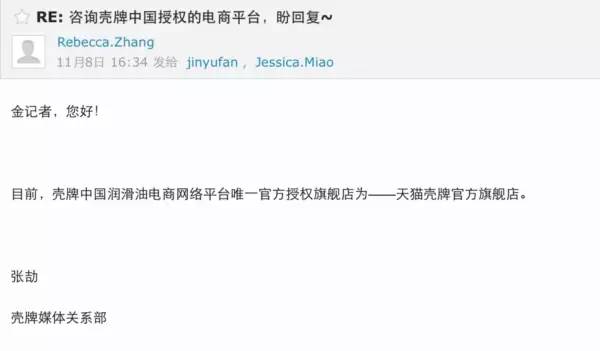 紧接着,我们又向壳牌媒体关系部求证,对方明确表示:“目前,壳牌中国润滑油电商网络平台唯一官方授权旗舰店为——天猫壳牌官方旗舰店。”也就是说,壳牌公司壳牌中国润滑油的电商销售平台不包括京东。