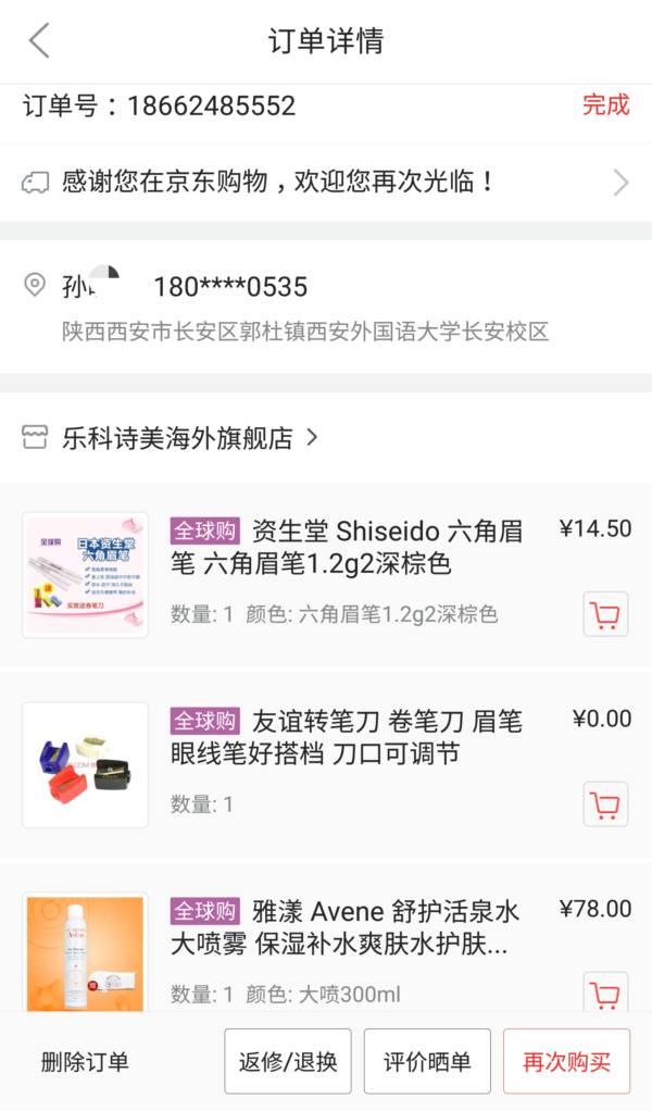 不久前,孙彤(化名)向我们反映,她于今年5月8日在全球购“乐科诗美海外旗舰店”购买的一瓶雅漾舒护活泉水(以下简称雅漾)是假货,并提供了两张对比图:瓶体对比图显示,正品雅漾瓶体logo边缘清晰;在京东全球购购买的雅漾,瓶体logo边缘模糊。说明书对比图显示,正品说明书纸质偏薄,纸张发黄;在京东购买的雅漾说明书纸质偏厚、纸张发白;另外,两张说明书上的字体也不一致。