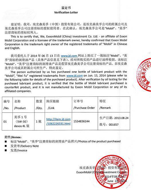 2014年7月9日,埃克森美孚(中国)投资有限公司官方发布声明称:“我司委托人于2014年6月13日在京东上购买了一瓶标注‘Mobil’、‘美孚’商标的润滑油产品。经对所购买的产品进行油样检测,该标注‘Mobil’、‘美孚’注册商标的润滑油产品是假冒埃克森美孚公司的注册商标的产品,非埃克森美孚公司或其附属公司所生产,特此鉴定。”