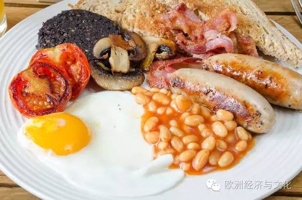 「全英式」(full English)早餐是一种在英国极为常见的国民餐点,包含香肠、培根、蛋、番茄、吐司、磨菇、烤豆子和薯饼,想要的话,还可以配上「黑布丁」(黑色血肠),通常饮料是配咖啡或茶,在英国和爱尔兰特别受欢迎。