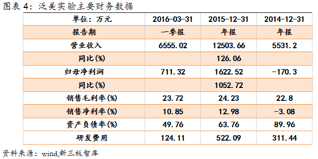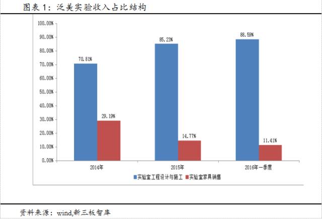 泛美实验提供实验室智能系统工程一站式服务,主营业务收入来自实验室工程的设计与施工、实验室家具的设计与销售。如图表1所示,至2015年年末,实验室工程的设计与施工收入为10573万元,占比达85%左右,实验室家具的设计与销售收入为1831万元,占比约为15%左右,至2016年一季度,两者比例大概为88%:12%,与2015年年末相比出现小幅变动。