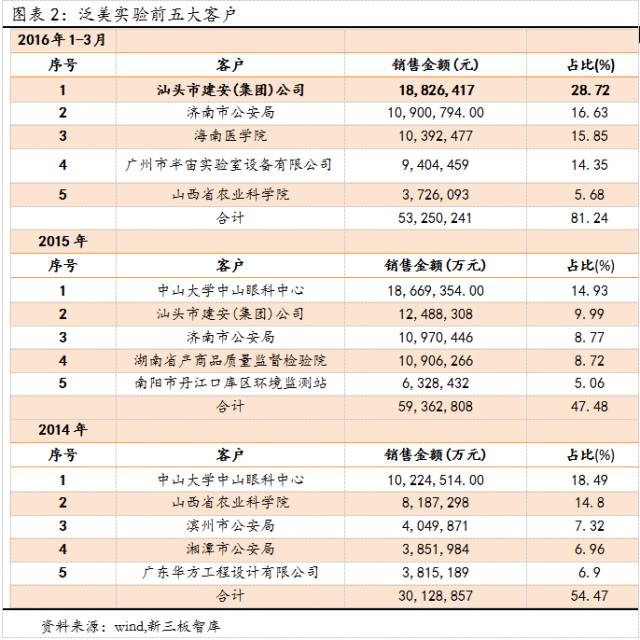 如图表2所示,可以看出,2014年、2015年与2016年一季度,泛美实验的前五大客户大部分是政府单位,包括公安局、质监局、科学院等,其中部分客户连续2年进入前五大客户,主要是因为公司在2014年以前即已接单确定客户,工程在随后2年完成施工,即会按照工程进度分2年结转收入。