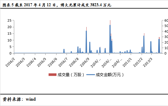 进入2016年7月后,公司交易开始活跃,截至2017年4月12日,公司累计成交3823万元。公司在2016年2月15日挂牌进行协议交易,一直到2016年6月都未发生成交,进入2016年7月后,交易逐步开始活跃,2016年11月16日创造了最大成交量(25.2万股)和成交额(508.1万元)。截至2017年4月12日, 该股累计成交167.1万股,累计成交额为2823.4万元。