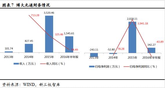 博大光通于2016年2月15日在新三板挂牌,协议转让方式交易,截至2016年11月23日,公司总股本1825万股,其中约1176万股是流通股,均在新三板交易。