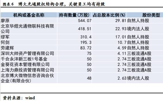 截至2016年6月30日,公司前十大股东中,北京华煜光通物联科技有限公司和北京博大微物信息咨询合伙企业(有限合伙)为核心员工持股平台,机构股东为深圳大帅资产管理有限公司、千合永沣新三板1号基金、金葵花资本管理有限公司和上海力鼎投资管理有限公司。其中董事长廖原持股29.81%,为第一大控股股东。