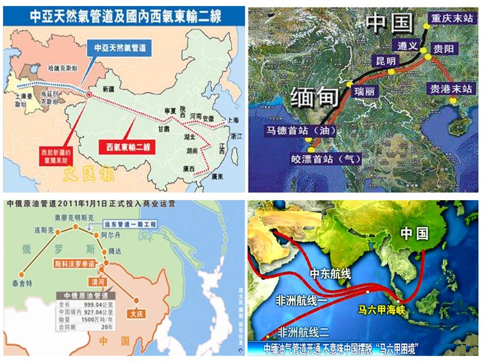 一带一路的核心在“西进东出”,西进即以新疆为核心区域,主要打通阿拉伯国家、中亚各国、俄罗斯等国矿产和能源通道,相继开通中亚天然气管道、中俄原油管道、中缅油气管道,加上原有的海路油气运输航线,四条能源通道保证了未来能源供给的稳定与安全。