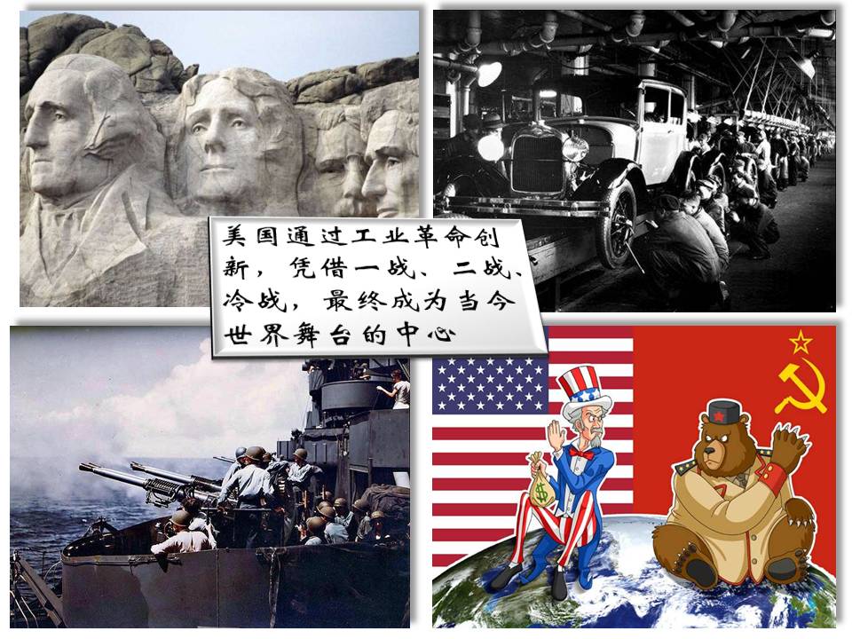 二战后,世界强国们都认识到武力扩张和殖民地之路不可行,逐渐开始理智地寻找大国之路。美国利用工业革命和战争积累的财富,通过信息革命和高科技领域的领先使得国家持续发展,成为了世界的主角。