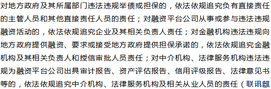 三是严格依法依规追究责任。针对涉嫌违法违规融资担保的责任主体,《通知》明确对地方政府及其所属部门违法违规举债或担保的,依法依规追究负有直接责任的主管人员和其他直接责任人员的责任;对融资平台公司从事或参与违法违规融资活动的,依法依规追究企业及其相关负责人责任;对金融机构违法违规向地方政府提供融资、要求或接受地方政府提供担保承诺的,依法依规追究金融机构及其相关负责人和授信审批人员责任;对中介机构、法律服务机构违法违规为融资平台公司出具审计报告、资产评估报告、信用评级报告、法律意见书等的,依法依规追究中介机构、法律服务机构及相关从业人员的责任。