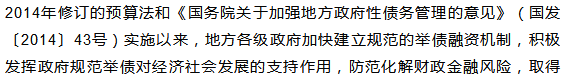 了阶段性成效。(联讯麒麟堂:地方政府性债务,最大的问题在于增速过快,2013年6月至2014年底,政府负有偿还责任的债务增长了41.3%,或有债务增长了22.9%。新预算法和43号文修明渠、堵暗道,赋予地方政府适度举债的权限,同时剥离融资平台公司的政府融资职能。用表内融资代替野蛮生长的城投模式,一定程度上缓解了地方政府的债务风险。