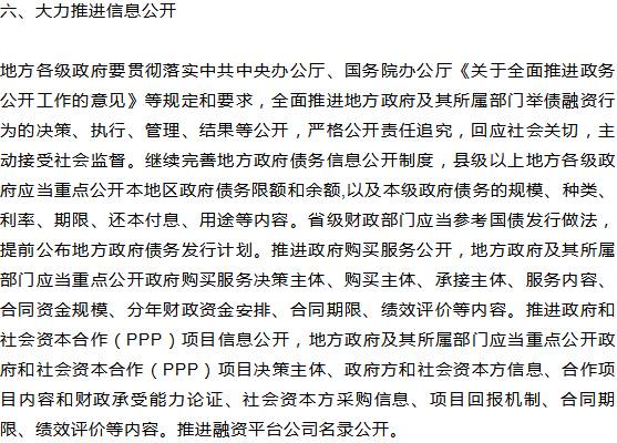 六是大力推进信息公开。《通知》依据现行法律法规和政策规定,要求全面推进地方政府及其所属部门举债融资行为的信息公开,严格公开责任追究,主动回应社会关切,自觉接受社会监督。