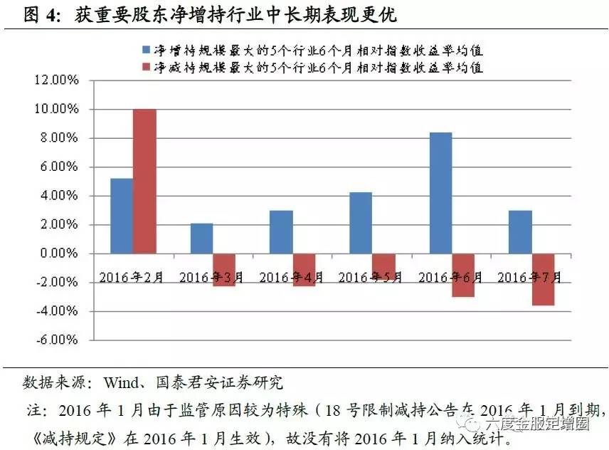 低估值行业更易获重要股东增持,净增持规模较大行业未来表现更优。对2016年分月增减持规模较大行业其未来6个月的股价表现进行统计,我们发现,本月净增持规模较大行业在未来6个月股价表现普遍优于大盘,且多数情况下优于遭净减持规模较大行业。选择未来六个月收益率的原因是,根据现行《证券法》第四十七条,上市公司董事、监事、高级管理人员、持有上市公司股份百分之五以上的股东,将其持有的该公司的股票在买入后六个月内卖出,或者在卖出后六个月内又买入,由此所得收益归该公司所有,公司董事会应当收回其所得收益。