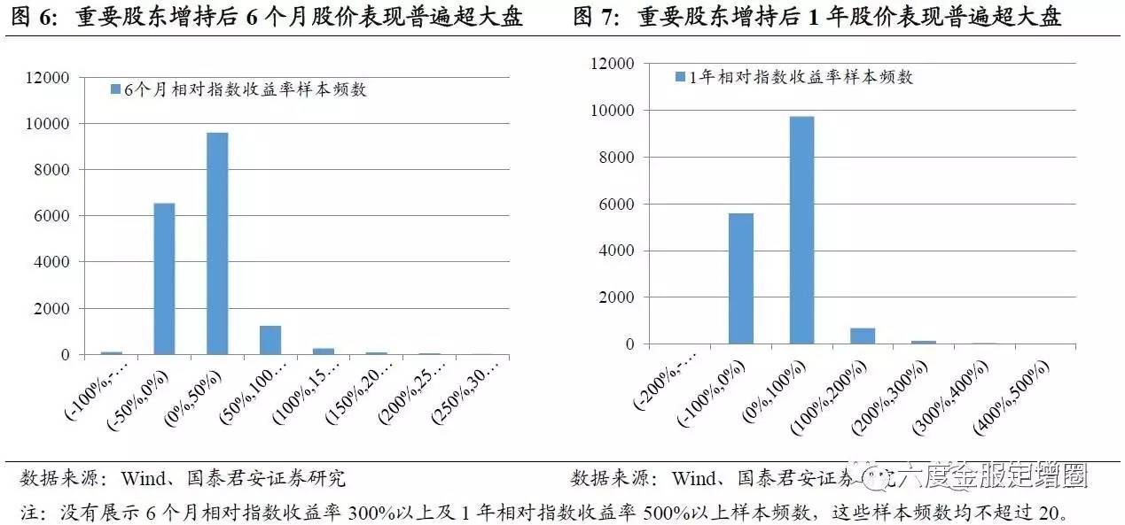 从我们对2011年-2016年获重要股东增持样本的统计来看,这些股票在中长期表现远好于大盘。重要股东增持6个月后相对指数收益率均值为12.80%,个别股票还出现了200%以上的相对指数收益率。增持1年后相对指数收益率均值为21.41%,个别股票甚至出现300%以上的相对指数收益率。