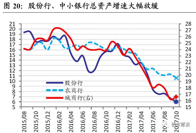 股份行、城商行总资产增速大幅回落8.6和7.5个百分点至6%和16.6%,农商行也明显放缓5.9个百分点,截止3季度,民生、中信、九台农商行等上市银行总资产出现负增长;中小银行理财扩张大幅放缓,城商行、农商行理财增速较16年同期骤降47.4和105.7个百分点,同业理财累计缩水超过2.2万亿;前11月新增委托贷款较16年少增1.06万亿,中小银行新增“股权和其它投资”项同比少增达5.67万亿。