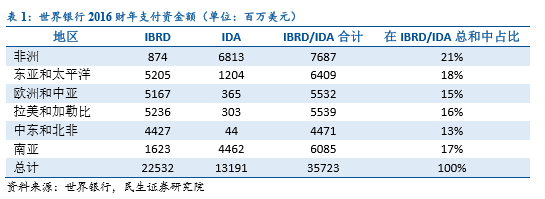 世界银行目前在全球设有130多家代表处。2016财年,世界银行向成员国和私营企业提供贷款、赠款、股权投资和担保共642亿美元。IBRD资金流向主要为东亚和太平洋、拉美和加勒比海、中东和北非;IDA主要支持非洲和南亚。其中,“一带一路”相关区域分布如下:东亚和太平洋地区6409百万美元,占比18%,欧洲和中亚5532百万美元,占比15%,中东和北非4471百万美元,占比13%,南亚6085亿美元,占比17%。