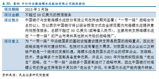 2015 年,通过公司贷款、保函和信用证等方式,累计向“一带一路”沿线国家新投放授信约 286 亿美元,跟进重大项目约330个,意向性支持金额约870亿美元。在“一带一路”基础设施项目方面,为国内企业在沿线国家的并购、投资提供信贷支持。与安徽海螺水泥股份有限公司、招商局集团、中国石油天然气集团公司、中国海洋石油总公司、中国电力建设集团等大型企业签订“一带一路”战略合作协议。