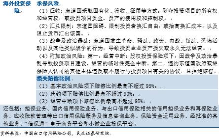 信用保险机构参与“一带一路”的方式主要是为企业的海外投资提供出口信用保险,相当于国内企业投资海外项目的“定心丸”。因“一带一路”发展重心主要集中在基建,能源等施工周期长,体量大,资金需求量大项目,并且部分国家投资环境尚不稳定,所以企业需要出口信用保险来提供保障。但由于这种保险风险较大,难以测算,所以目前我国企业出口信用保险主要是政府支持的中国出口保险信用公司提供。