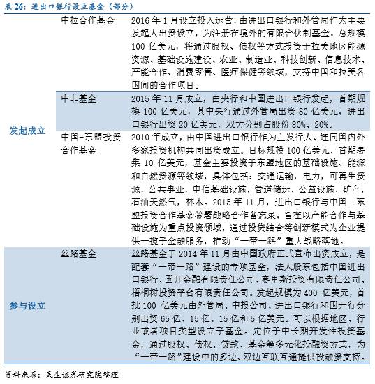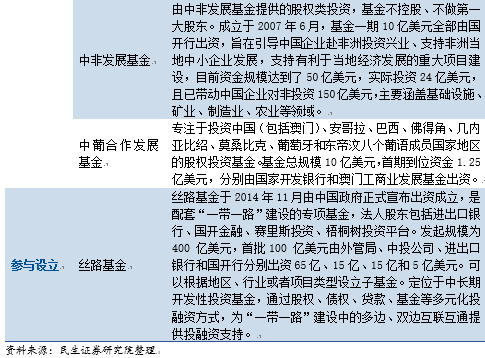 按照资金来源,目前“一带一路”融资结构中,分为以下几个层次,第一层是国内政策性银行,国开行和口行,尤其是国开行是中国最大的对外投融资银行,两者不仅提供传统授信,而且建立了中外合作基金;第二层是新兴多边开发金融机构,以“一带一路”量身打造的亚投行和丝路基金为代表,两者均以国际标准建立,其中丝路基金主要以股权投资为主;第三层是国内商业银行,主要以四大国有商业银行为主,其中中国银行和工商银行凭借其海外分支机构和成熟的多元化融资服务体系,在“一带一路”融资中市场份额较大;第四层是传统世界多边金融机构,世界银行和亚洲开发银行与“一带一路”关联密切;第五层为进出口信用保险为代表的辅助机构。