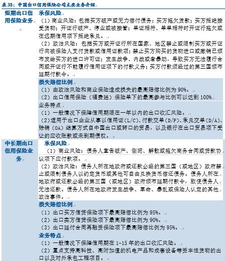 中国出口信用保险公司是我国唯一一家承办出口信用保险业务的国有政策性保险公司,为“走出去”企业提供的业务主要有短期出口信用保险、中长期出口信用保险和海外投资保险。