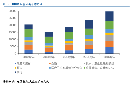 行业分布方面,IBRD融资主要在于公共管理、法律和司法,能源和采矿,交通,供水、卫生设施和防洪,与“一带一路”相关的设施联通主要为后三者,三者占世界银行资金供给的近一半。且通过现有案例来看,亚投行、丝路基金以及政策性银行对“一带一路”沿线的投资很大部分为与世界银行合作投资。