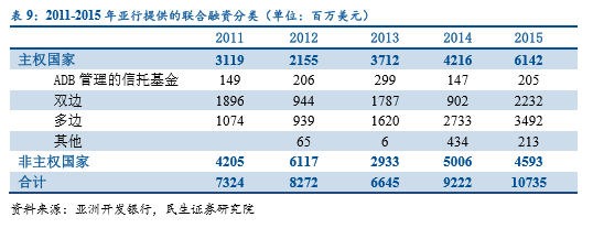 亚洲开发银行是联合国亚洲及太平洋经济社会委员会建立的机构,主要为促进亚洲及太平洋地区发展中成员经济和社会发展,68个成员国中48个来自亚太地区,总部位于菲律宾首都马尼拉,区位优势明显。东南亚地区是目前“一带一路”进展最好的地区之一,东南亚地区的“一带一路”融资可寄希望于亚行。亚行主要通过提供贷款、联合融资担保、技术援助和赠款等方式支持其成员在基础设施、能源、环保、教育和卫生等领域的发展。且,亚行作为区域性开发机构,在联合性担保融资方面可与国内商业银行展开合作,提高增信、降低融资成本。
