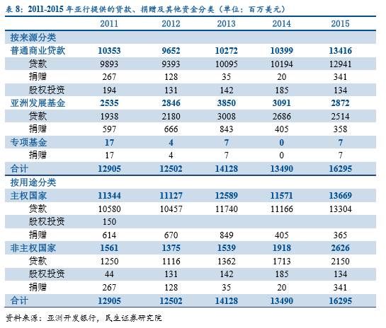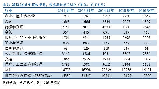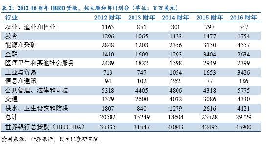 一传统世界多边金融机构对“一带一路”信贷融资的传统世界多边金融机构主要为世界银行和亚洲开发银行。世界银行中主要贷款机构为IBRD,小部分为IDA,2016财年,世界银行向成员国和私营企业提供贷款、赠款、股权投资和担保共642亿美元,“一带一路”相关地区占比60%左右。其中IBRD对能源和采矿,交通,供水、卫生设施和防洪三者占世界银行融资的一半左右,与“一带一路”推进产业联系密切。