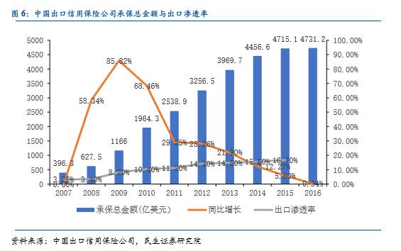 中国出口信用公司自成立以来,对国内企业出口投资的支持作用日益显著,承保金额一直保持增长,从2007年的396.3万亿上升到了2016年的4731.2万亿人民币。出口渗透率(为出口信用保险承保金额占总出口额的比例)逐年稳步上升,从2007年的3.25%一直提高到2015年的16.7%,已超过发达国家平均值(15%)。截至2016年末,中国信保已累计投资国内外贸易项目2.8万亿美元,累计赔付94.8亿美元,通过带动233家银行累计为出口企业融资超过2.7万亿人民币。