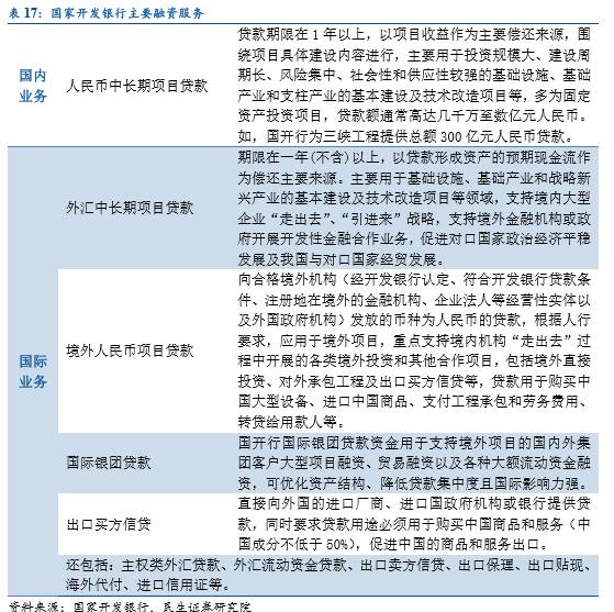 国开行主要发行中长期信贷,发放的贷款种类主要包括基本建设贷款、技术改造贷款、设备储备贷款、技术援助贷款、外汇固定资产贷款、外汇流动资金贷款等。服务“四化同步”、粮食安全、新农村建设、养老体系建设、“一带一路”等国家战略;以及中小企业贷款、并购贷款、人民币中/短期流动资金贷款、应急贷款、境内一般银团贷款等针对不同主体/目的融资服务。